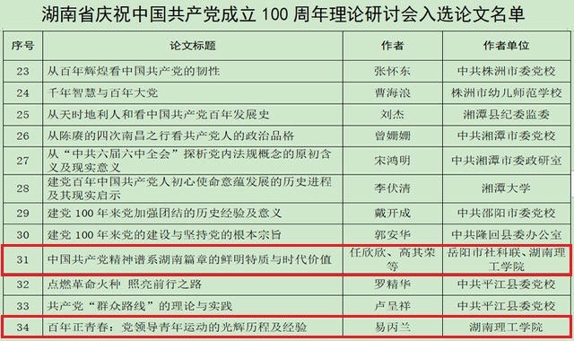 在庆祝中国共产党成立100周年之际,yl8cc永利官网教师有2篇党史理论研究论文入选湖南省庆祝中国共产党成立100周年理论研讨会论文,3篇党史理论研究论文入选岳阳市庆祝中国共产党成立100周年理论研讨会论文。