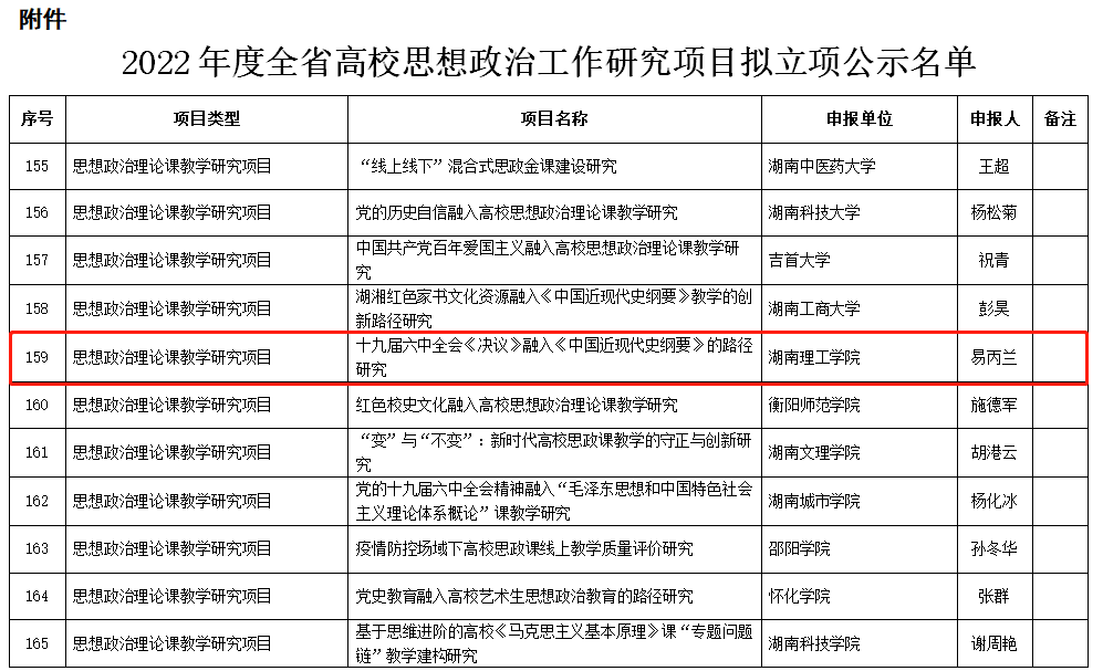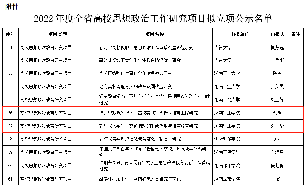 近日,湖南省教育厅发布《关于2022年度全省高校思想政治工作研究项目评选结果的公示》,yl8cc永利官网教师刘小华副教授的《 新时代大学生生态价值观的生成逻辑与培育路向研究》和粟锋博士《“大思政课”视域下高校实施时代新人培育工程研究》获得高校思想政治教育研究项目立项,易丙兰博士的《十九届六中全会<决议>融入<中国近现代史纲要>的路径研究》获得思想政治理论课教学研究项目立项,yl8cc永利官网本年度推荐的高校思想政治工作研究项目全部获批,立项率为100%。