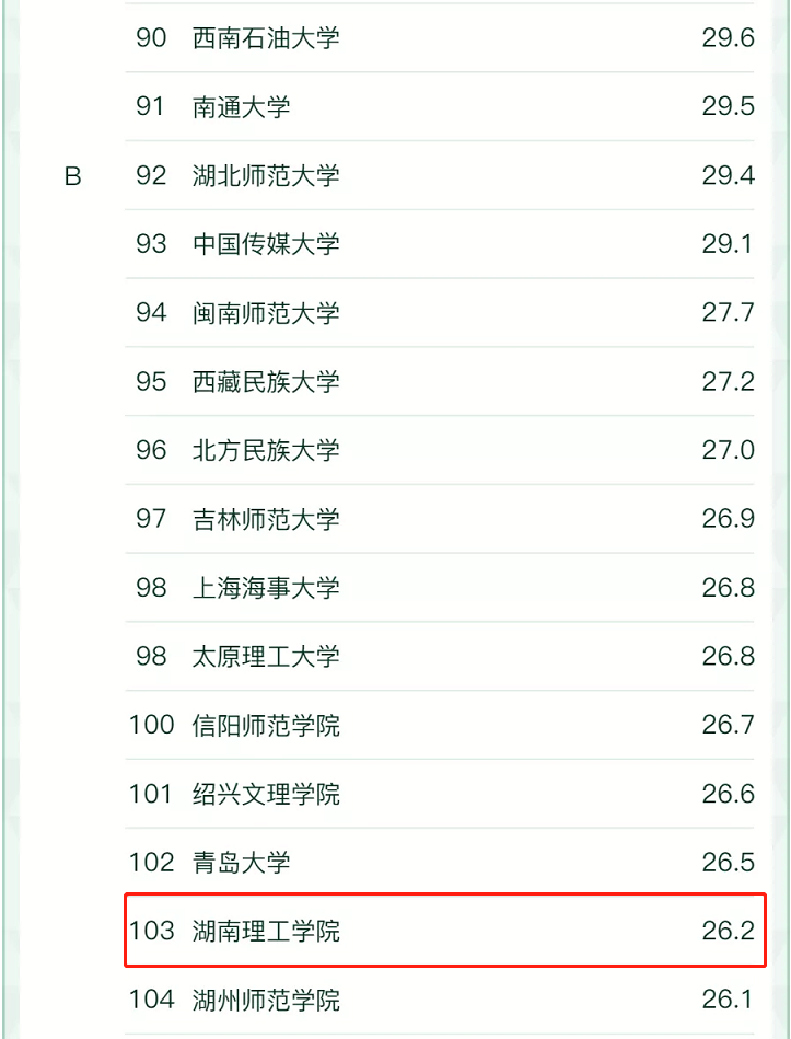 湖南省共有11所高校的思想政治教育专业上榜,排名靠前的是,中南大学排第14位、湖南师范大学排19位、湘潭大学排45位、湖南科技大学排61位,我校排名103位,位居全省第五;还有湖南第一师范学院、湖南农业大学、衡阳师范学院、湖南城市学院、吉首大学、湖南文理学院等高校榜上有名。