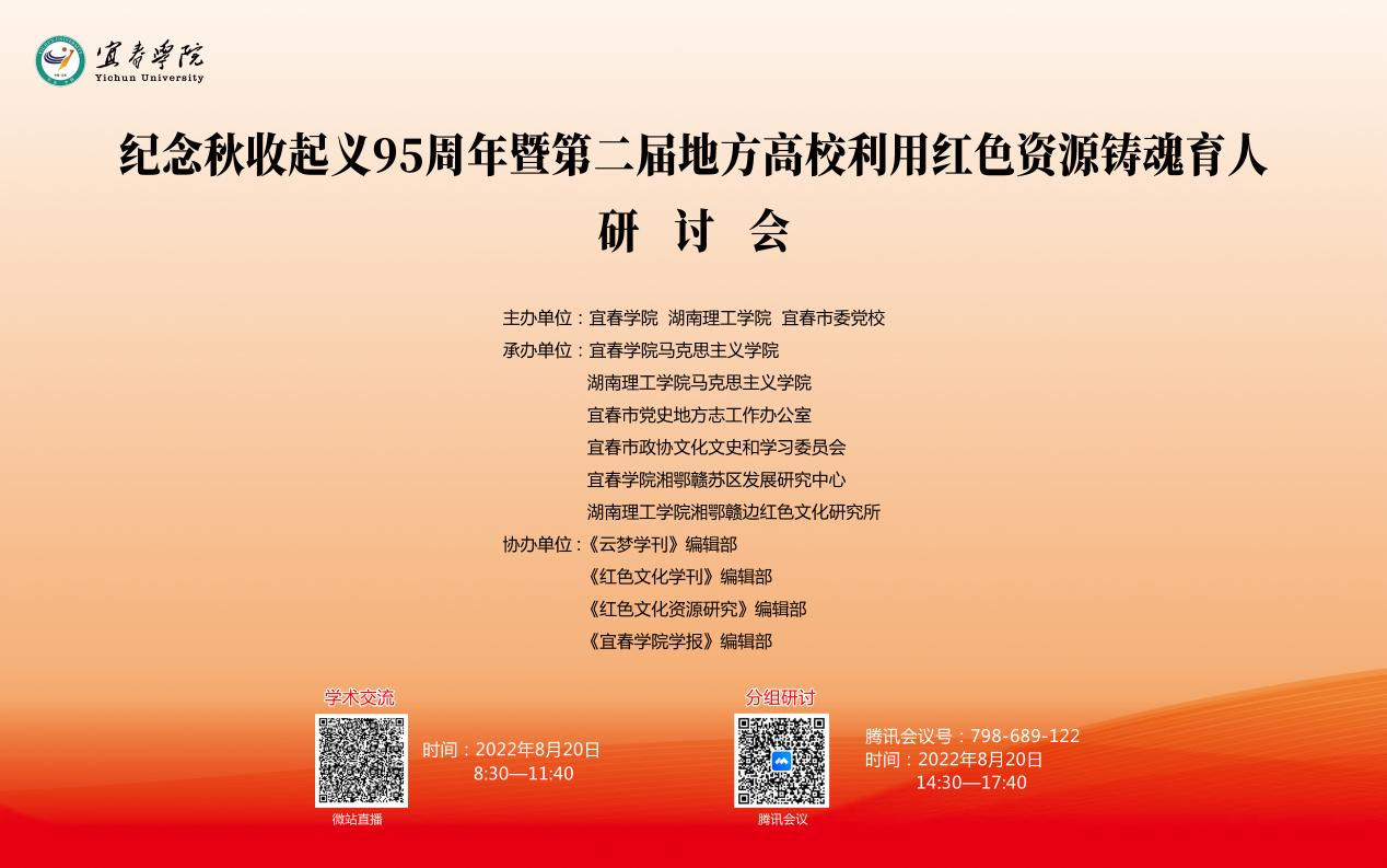为了纪念秋收起义爆发95周年,探讨开发和利用地方红色资源进行大学生思想政治教育,加强地方高校之间合作,8月20日,我校联合宜春学院、宜春市委党校主办了主题为“纪念秋收起义95周年暨第二届地方高校利用红色资源铸魂育人”的学术研讨会。大会以线上线下相结合的方式进行,线下会场设在宜春学院。
