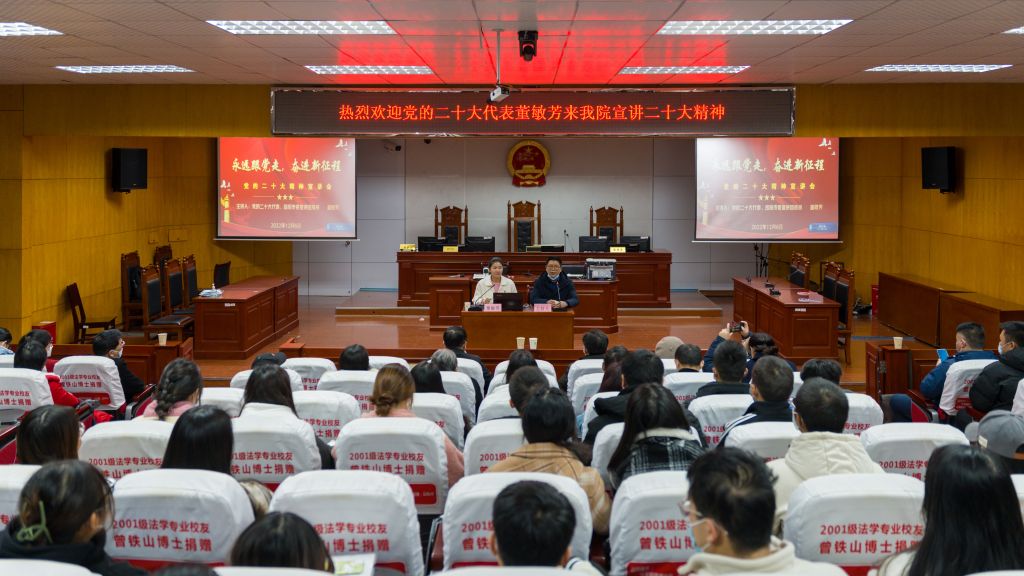 12月6日下午,党的二十大代表、岳阳市委宣讲团成员、岳阳县润升水稻专业合作社、丰润农机专业合作社理事长董敏芳女士在南院8号教学楼模拟法庭作党的二十大精神宣讲报告会。yl8cc永利官网全体教师、入党积极分子及学生干部代表参会。会议由学院副院长郑立新主持。
